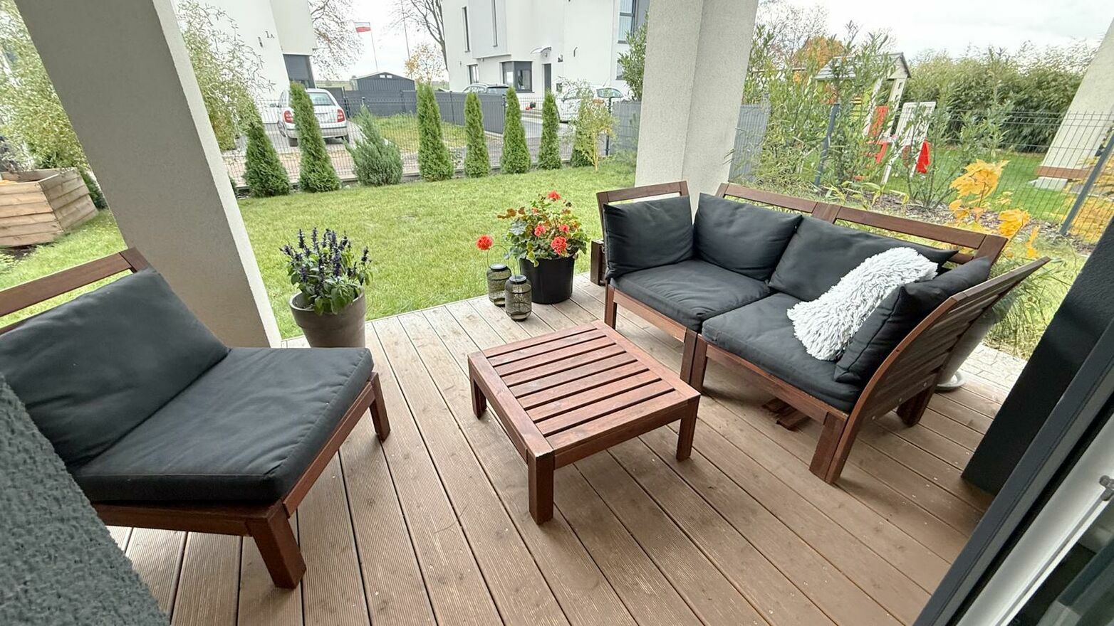 zagospodarowany ogród i drewniany taras