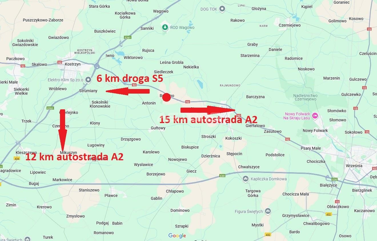 Ok 6km do drogi ekspresowej S5 i dalej ok 12km do autostrady A2.