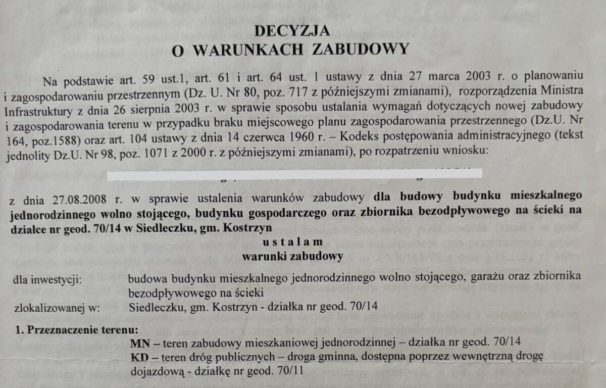 Działka ma bardzo korzystny, prostokątny kształt, co daje duże możliwości zagospodarowania przestrzeni i budowy wygodnego domu z ogrodem. Dla nieruchomości wydane zostały warunki zabudowy na dom jednorodzinny wraz z garażem. Bezpośrednio w drodze przy działce dostępne są media: prąd, woda oraz telefon, co znacznie ułatwia rozpoczęcie inwestycji.